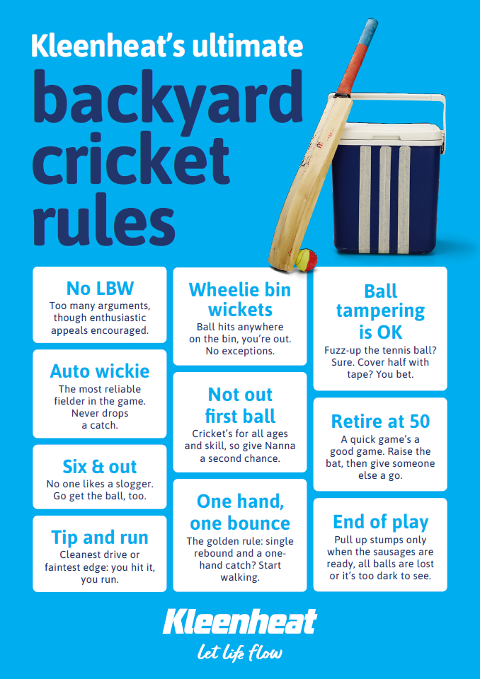 Download Kleenheat’s ultimate backyard cricket rules poster and enjoy a season of argument-free backyard cricket at your place.