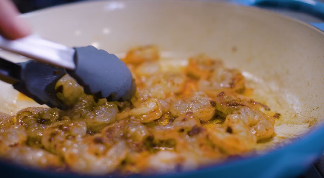 - Heat frypan to medium-high heat and pour in 2 tablespoons of oil. Once the oil begins to shimmer, add prawns mixture and cook, stirring occasionally, until prawns turn pink and cooked through, 1–2 minutes. Remove pan from heat.