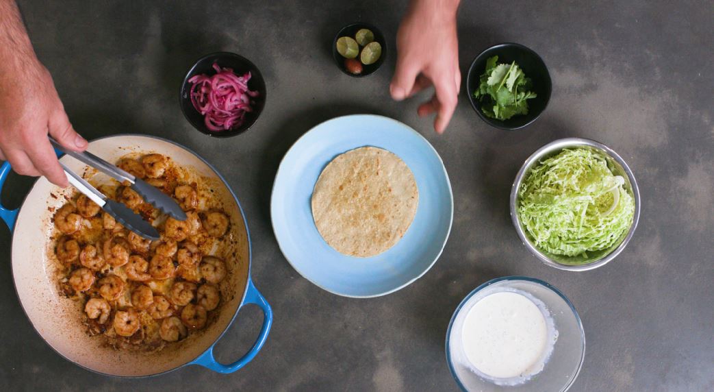 - Unwrap tortillas and build tacos with prawns, cabbage, garlic crema, coriander, and onions.