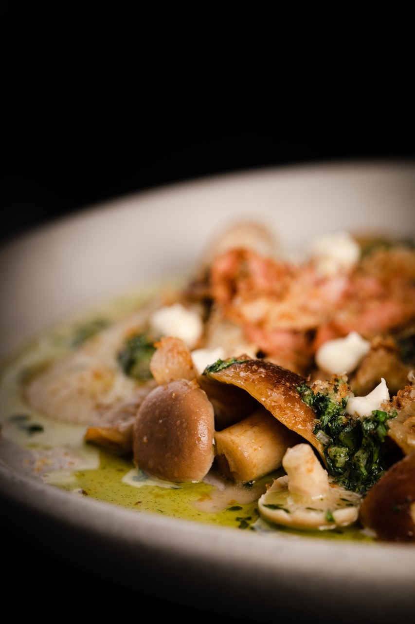Sauteed Mushrooms with chicken vinaigrette, macadamias & sourdough crackers, by Gord Khale.