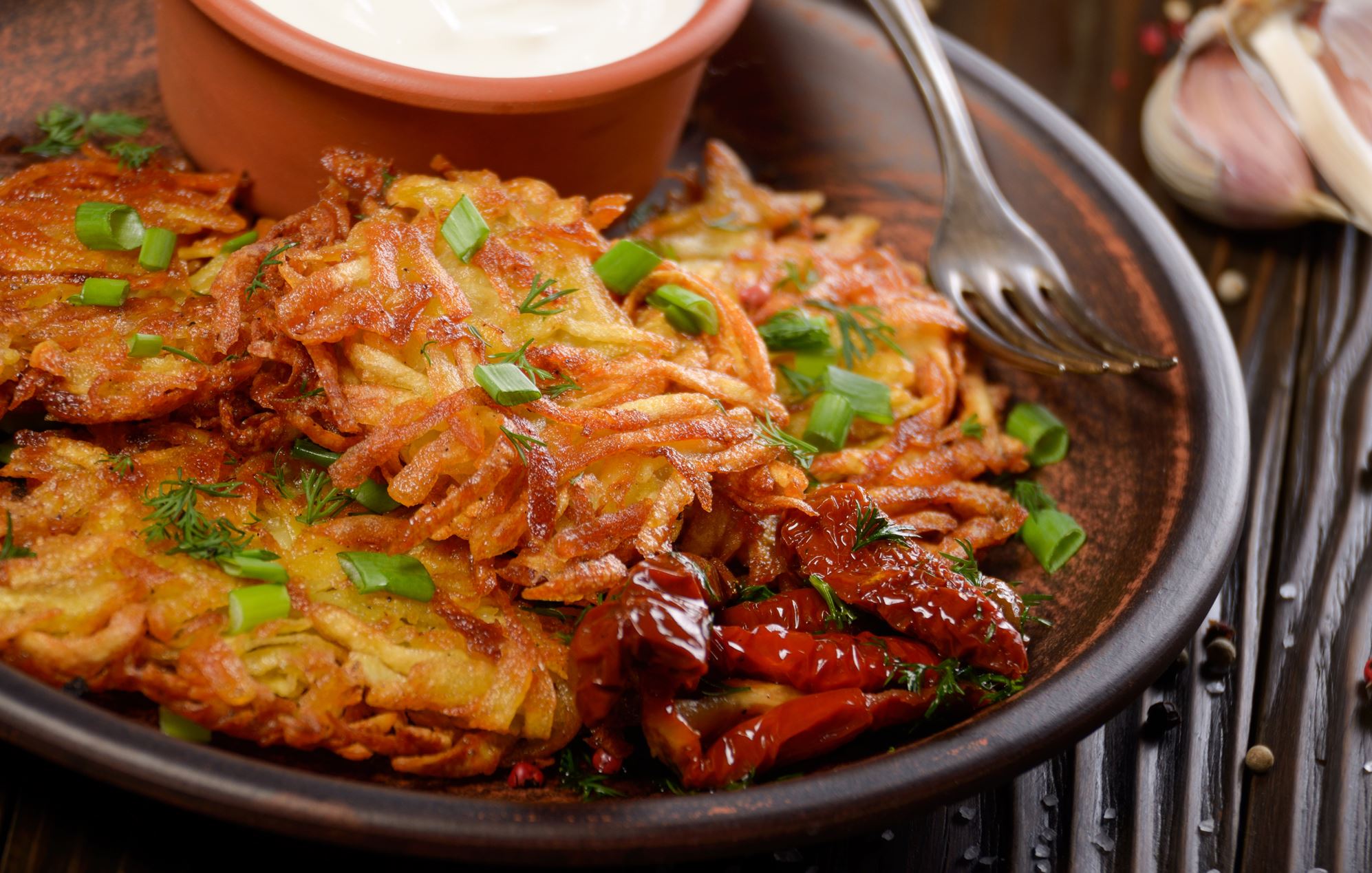 Vegetable fritters with herbed yoghurt and hot sauce by Gord Kahle.